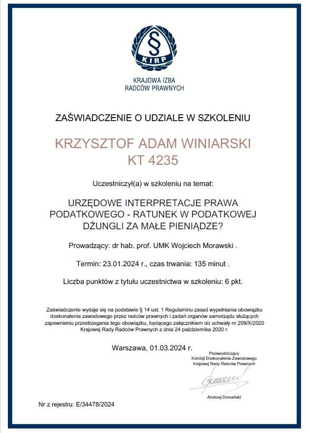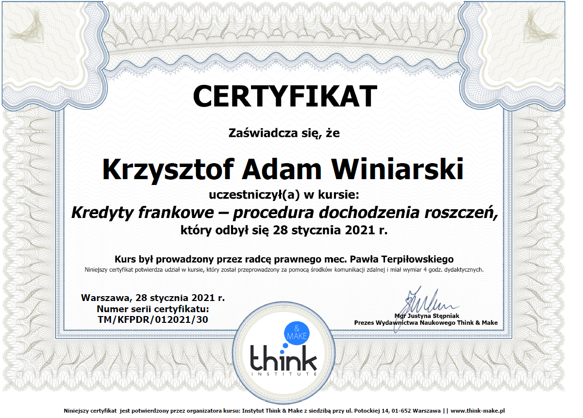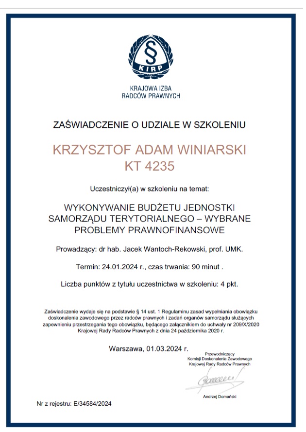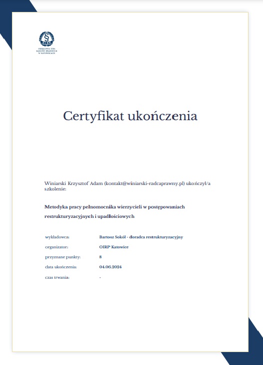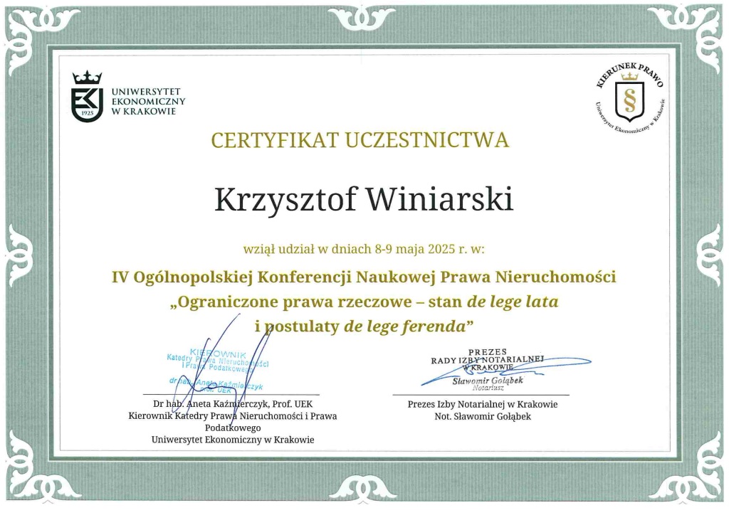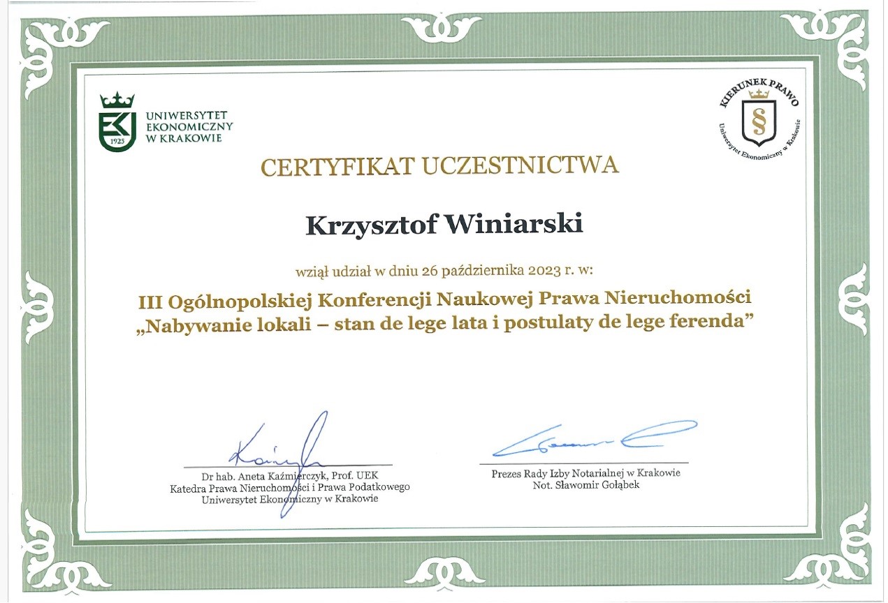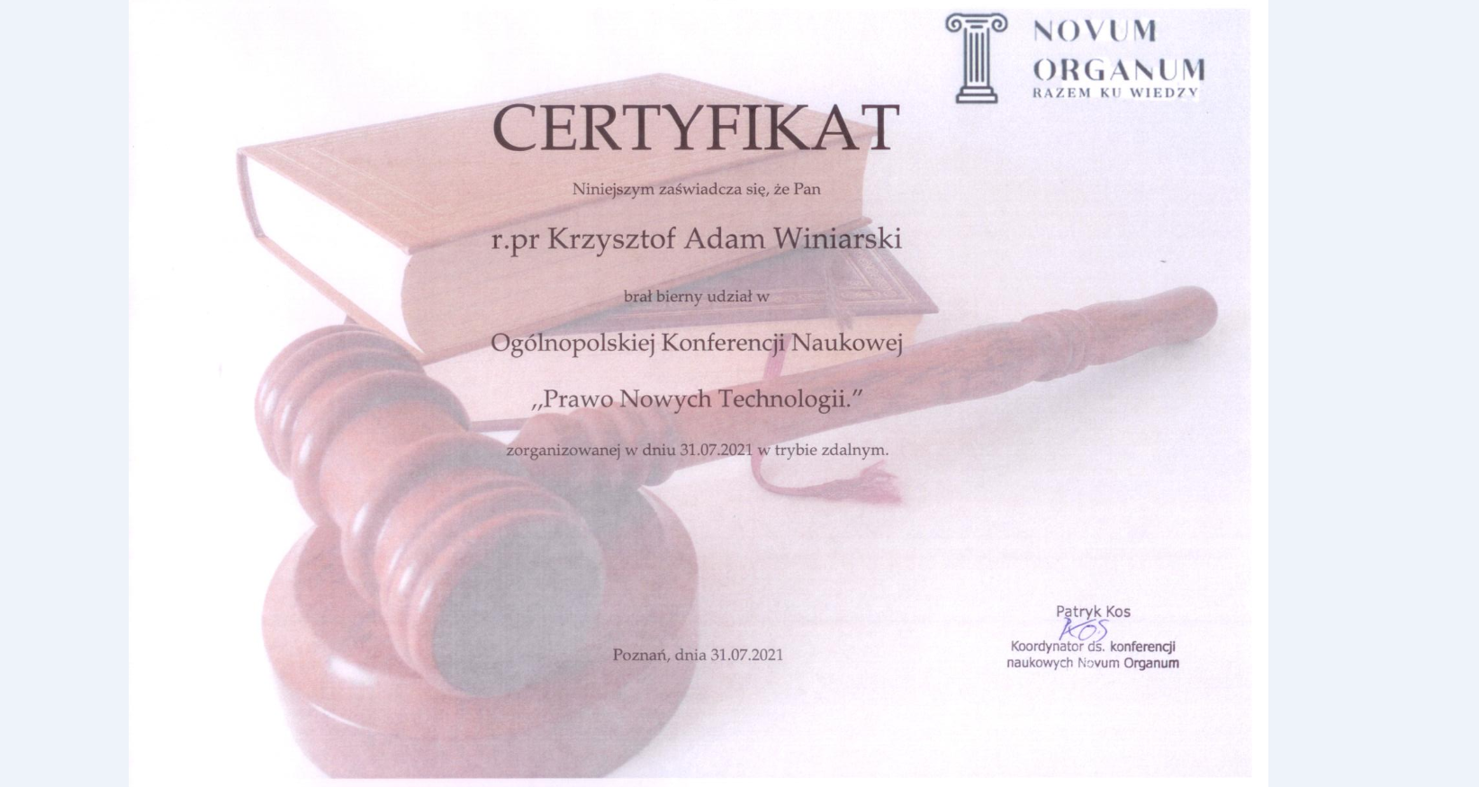 Chcąc zapewnić Państwu jak najlepszą obsługę prawną, informujemy, że nieustannie podnosimy swoje kwalifikacje poprzez udział w szkoleniach, kursach oraz konferencjach. Ostatnio należały do nich: